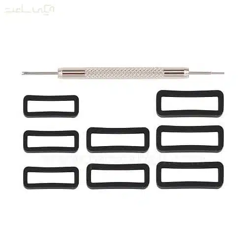 بسته بندی شامل: 8 عدد نگهدارنده ساعت سیلیکونی و 1 عدد ابزار تعویض